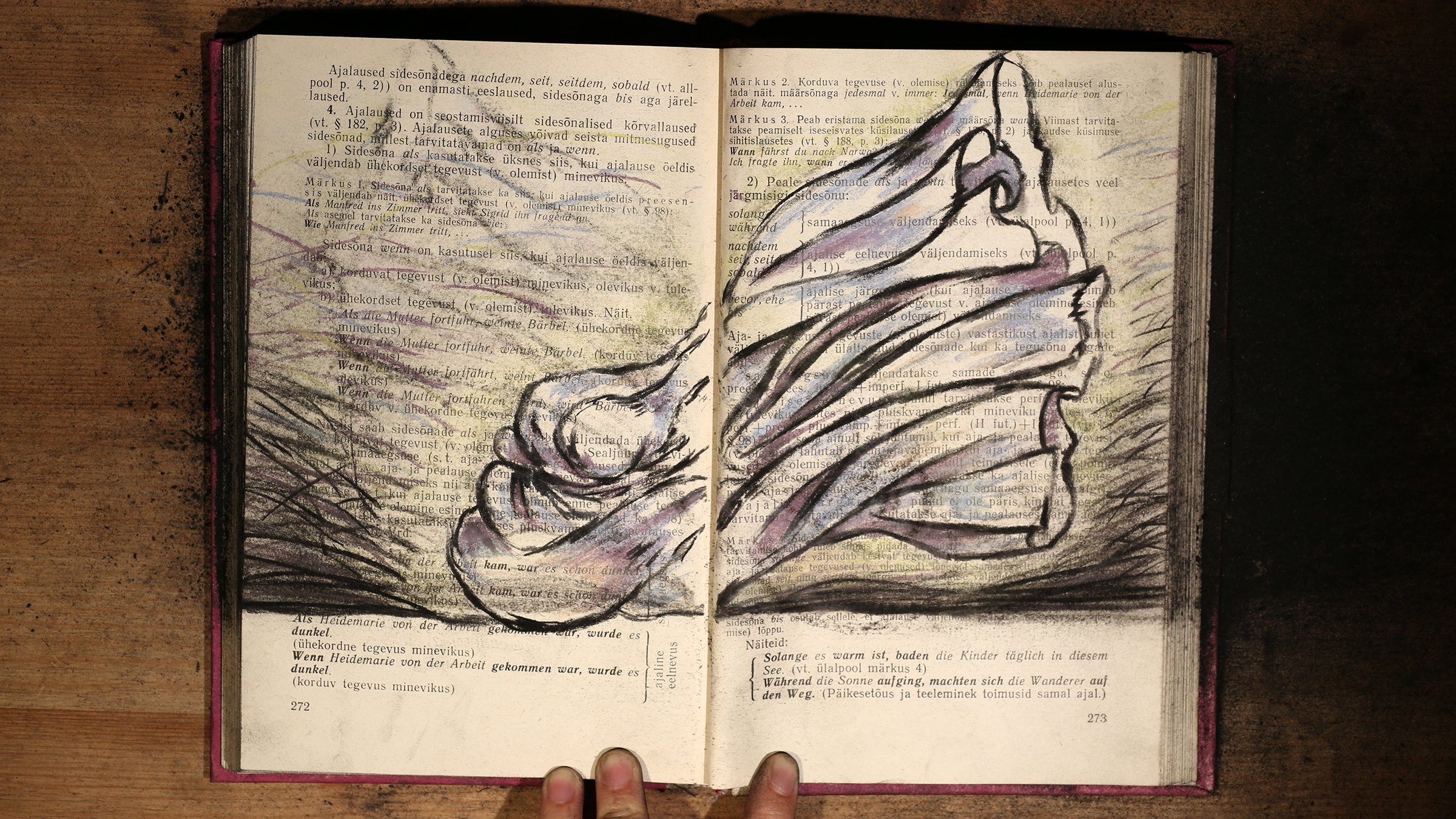 In The Last Visit (การพบพานครั้งสุดท้าย, 2024; YIDFF 2025 New Asian Currents), Thai animator Keawalee Warutkomain turns grief into a tactile experience. The 16-minute short grounds us with a picture and a brief dedication, before unfolding entirely in animation form within the pages of an old Estonian book, its title meaning “Village” or “Visit.” Across its yellowed paper, Warutkomain’s charcoal drawings appear, dissolve, and return, filmed in delicate stop motion. We never know what the printed text says, and that omission is part of the film’s aesthetic: the abstract drawings made on the book’s body matter more than its words. Its premise is deceptively simple—a young woman recalls a loss she could not physically witness while abroad. But Warutkomain’s narrative and stylistic choices do more than evoke remembrance—they create a form of survival against forgetfulness.