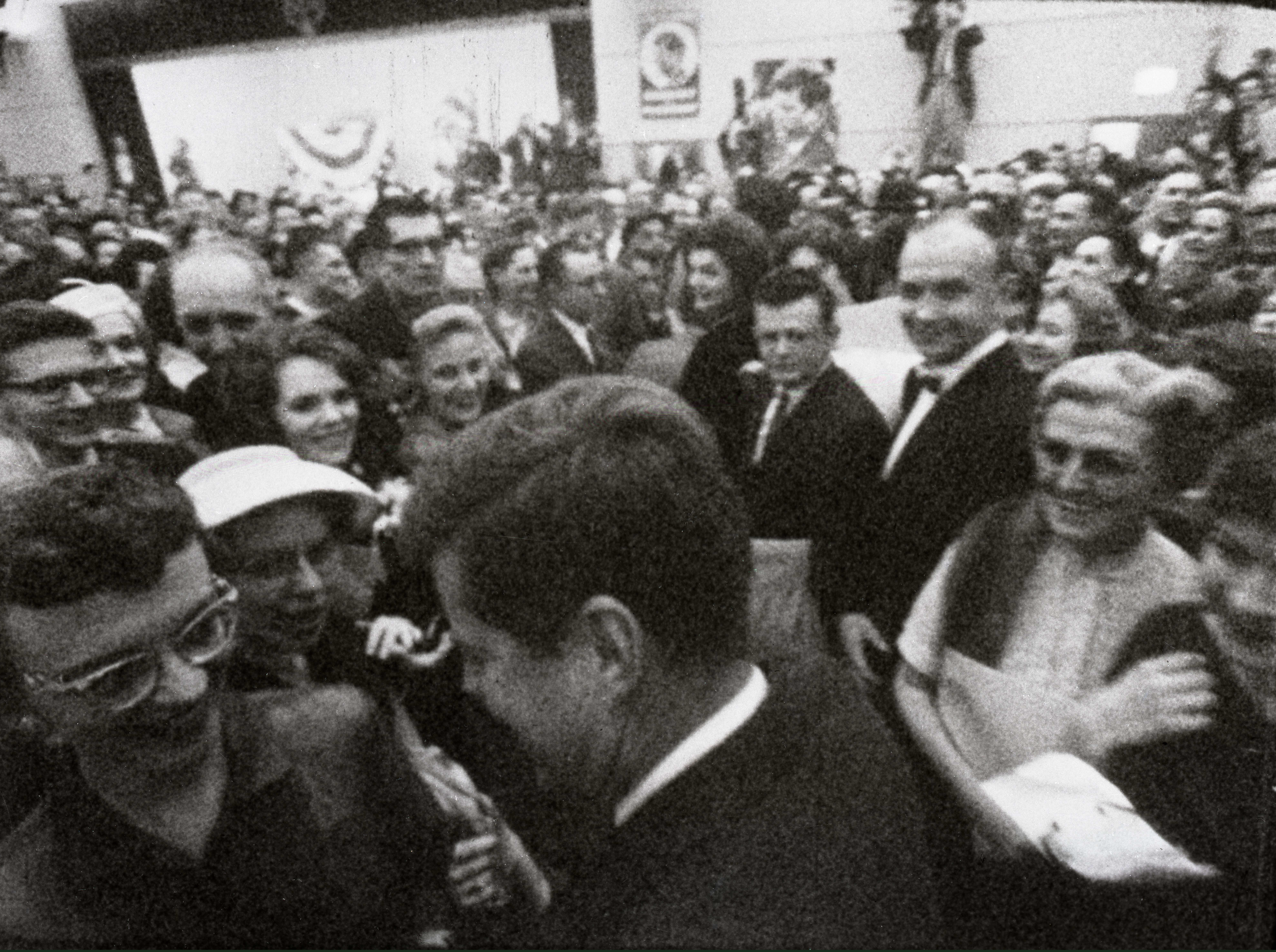 では、選挙戦のもう一人の候補者、若き日のジョン・F・ケネディはどのように映画に登場していたのか。初めて画面に現れるシーンで、ケネディは選挙スタッフに取り囲まれながらその間を縫うようにして演説会場の階段を駆け上がり、大挙して詰めかけた民衆の待つ壇上に到達する。割れんばかりの拍手と歓声が起こると、彼ははにかむような笑顔でそれに応え、誇らしげな笑みを浮かべるジャクリーン夫人がその傍らに立つ。のちに監督としてもダイレクト・シネマの重要作品を生み出すことになるアルバート・メイズルスは、持ち上げたキャメラを両手で支えながらケネディの動きを背後から追いかけ、壇上で彼の前に回り込むことで、ケネディの表情と民衆の熱狂を一つのショットで同時に捉えることに成功している。